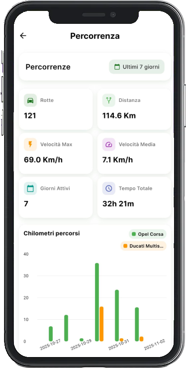L’app è un client leggero con dashboard e grafici chiari. Interagire con funzionalità complesse (statistiche, Geofence) diventa semplice e veloce, migliorando l’usabilità quotidiana.
